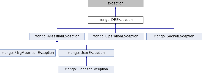 Inheritance diagram for mongo::DBException:Most mongo exceptions inherit from this; this is commonly caught in most threads.