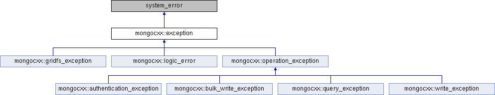 Inheritance diagram for mongocxx::exception:A class to be used as the base class for all mongocxx exceptions.